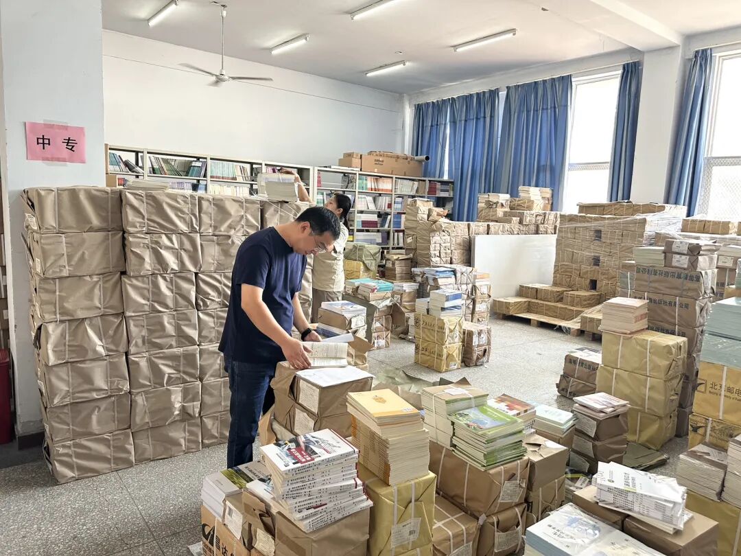 在教材发放之前,图书馆馆长张振江、副馆长张修和精心组织新教材的发放工作。他们积极与教务处、学生处、大专负责人、各学院教育教学负责人沟通协调,精准确定所需教材的数量,并制定出高效的发放方式。