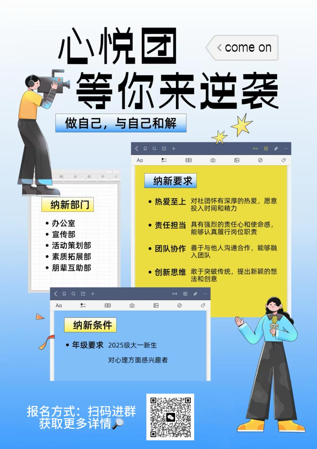关注心理状态是爱自己的表现,加入心理社团更是主动提升自我的选择。放下顾虑,这从来不是 “有问题” 的信号,而是拥抱更好自己的开始。