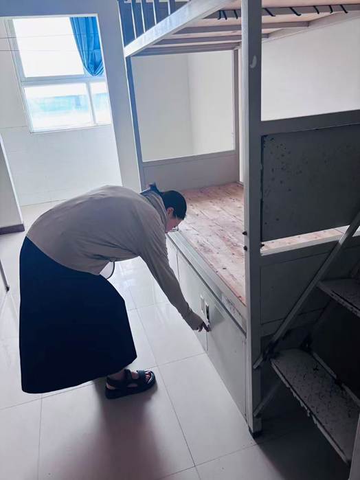 排查过程中,辅导员聚焦三大关键领域:一是电路与消防设施,逐一测试宿舍插座是否漏电,检查灭火器压力、有效期及位置是否便于取用,确保消防通道无杂物堆积;二是家具与生活设施,仔细检查床架螺丝是否松动、衣柜门是否完好、水龙头是否漏水,针对部分宿舍存在的“衣柜隔板变形”“插座位置不便”等问题,现场记录并联系后勤维修人员,要求在3日内完成整改;三是生活细节优化,辅导员提前在每间宿舍张贴“预防电信诈骗 提高防范意识”宣传册。