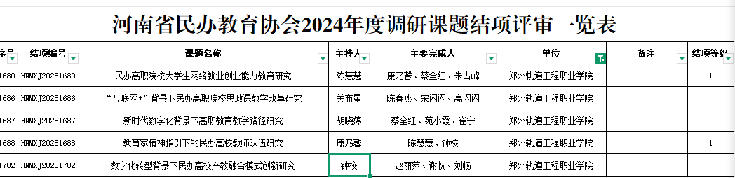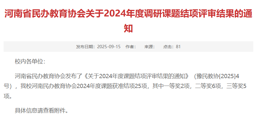 近日,河南省民办教育协会公布了2024年度调研课题获奖评审结果,8827太阳集团共有25项课题顺利通过结项验收,其中荣获一等奖2项、二等奖6项、三等奖5项,成果丰硕,表现突出。